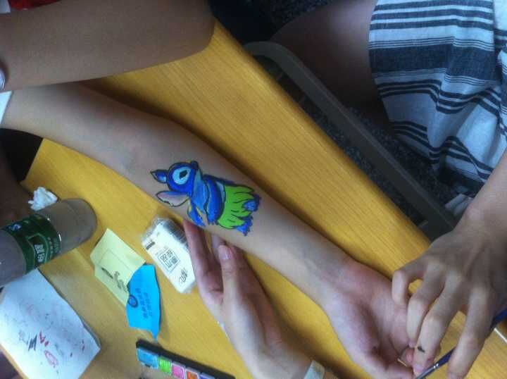 此后,我们还参观了人体彩绘社。彩绘社的社员可以在同学的手臂上画出各种惟妙惟肖的卡通人物形象。轻音社是一群热爱音乐的同学的聚集地。弹吉他的少年在舞台中央轻轻拨动琴弦,台下的听众陶醉在美妙的音乐中,任思绪徜徉。
