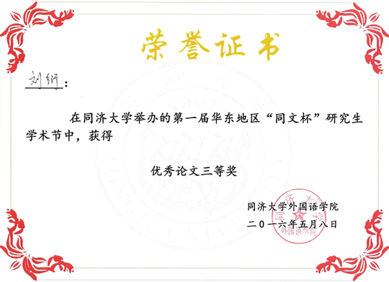 2016年5月8日,第一届华东地区“同文杯”研究生学术节在同济大学yl7703永利集团同文楼隆重举行。来自全国26所高校的上百名研究生济济一堂、共飨学术盛宴,围绕“国际视野与中国语境观照下的外国语言文学研究”这一主题,在语言学、文学和翻译等研究领域进行了充分交流。本次学术节共收到来自北京大学、中国人民大学、复旦大学、同济大学、中南大学、华东师范大学、上海外国语大学以及yl7703永利集团等26所高校的博士和硕士研究生投稿论文105 篇。我院方文开教授指导的2014级硕士研究生刘衍携论文参加了此次学术节。