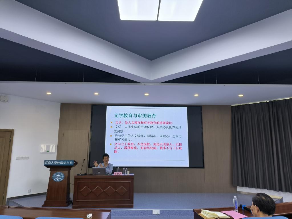 随后,查明建教授围绕“何为文学经典”“为何要读文学经典”以及“如何从文学经典阅读中培养审美能力”三个问题对文学经典作品在审美教育中的作用进行了深入的解读。他首先解释了文学经典的定义,阐述了阅读文学经典的重要性,指出文学不仅能帮助人们向上向善,还能让我们更深入地了解人性,洗涤灵魂。在谈到如何从文学经典阅读中培养审美意识时,查明建教授旁征博引中外名著,不仅让在场师生领略了大师风范,同时也展示了经典文学作品经久不衰的魅力。查明建教授强调,文学并不是与我们生活无关的一门学科,而是深深植根于我们日常生活之中,是人工智能时代背景下培养人文精神和审美能力不可或缺的重要渠道。