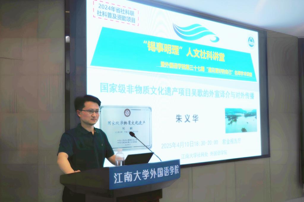 2025年4月10日晚,由社科处与yl7703永利集团共同主办的“锡事明理”人文社科讲堂暨yl7703永利集团第三十七期“遇见更好的自己”名师学术讲座——“国家级非物质文化遗产项目吴歌的外宣译介与对外传播”在yl7703永利集团君金报告厅举行。本次讲座由朱义华老师主讲,受到了2024年省社科联社科普及项目资助,同时也是2024年yl7703永利集团《英语口笔译》基层教学组织示范建设点、2024年yl7703永利集团“教学名师工作室”培育项目支持活动,吸引了全校众多师生,尤其是英语专业师生、文化研究者前往参加,共同探讨吴歌的外宣译介与对外传播。