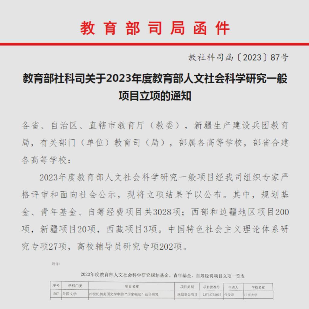 近日,教育部社科司发布了《关于2023年度教育部人文社会科学研究一般项目立项的通知》(教社科司函〔2023〕87号)。我院张俊萍教授主持的项目《20世纪初美国文学中的“国家崛起”话语研究》成功获得规划基金立项。该项目课题试图从新的视角对20世纪初的美国文学提出一系列新的认识,有助于我们深度理解和应对进入后崛起时代的当下美国,并有助于启发我们进一步思考中华民族伟大复兴的战略和策略。