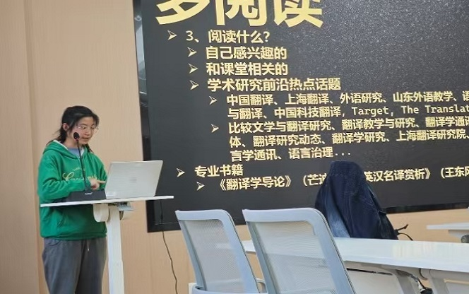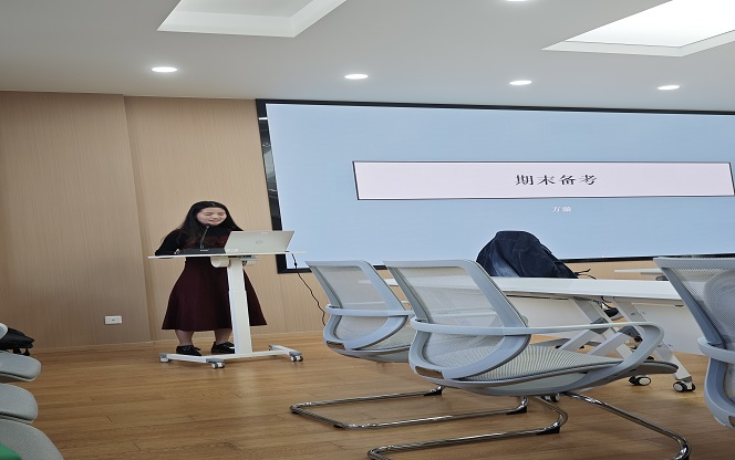 随后,活动进入了期末复习备考经验分享的环节。优秀学生代表方漩同学以其优异的成绩和丰富的备考经验,为研一新生提供了宝贵的复习策略。她从公共课、二外、选修课等多维度出发,细致讲解了各课程的听课技巧、复习方法及资料准备要点,并着重强调了考试诚信的重要性。她鼓励同学们以积极的态度面对每一场考试,努力争取优异的成绩。
