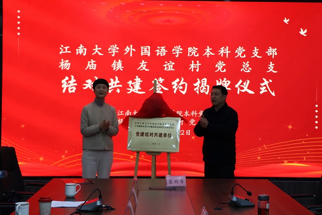 随后,顾海星与李源签订共建协议。李荣华与杨庙镇党委书记曹杰共同揭牌。接下来,两方领导分别发表讲话。曹杰提出,杨庙的发展迎来了新机遇,对于人才的需求正在不断增加,有了乡村振兴与人才培养的良好基础,架设好校村党建共建的联系桥梁,对外院与杨庙的发展都将大有裨益。李荣华的讲话聚焦于外语人的使命与担当。她提出,杨庙电商的发展,实际上是对中华传统文化价值的深刻把握与创新实现。作为外语人,将中华优秀传统文化讲出去、让中华优秀传统文化走出去是不变的责任。校村双方理念契合、方向一致,应进一步加强横向合作,将任务书、施工图、时间表、责任单的“规划蓝图”落地实施,共建聚合力,一起向未来。