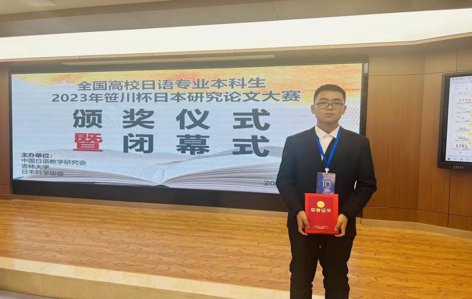 2023年11月18日,“2023年笹川杯日本研究论文大赛”在吉林大学圆满落幕。我校20级日语专业学生傅泽宇进入决赛,最终荣获文化组三等奖,21级学生高小博、任悦、刘舒宁三位同学获得语言组优秀奖。日语系刘建华老师、李智老师、吴颖老师分别荣获“优秀指导教师奖”。
