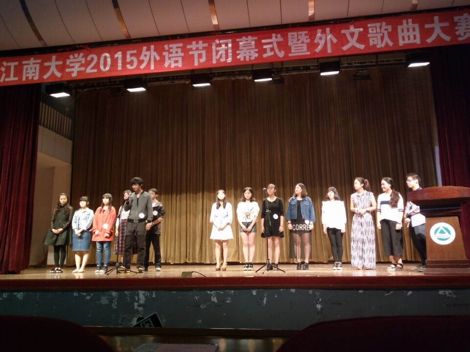 闭幕式后,外文歌曲大赛正式拉开序幕。各位歌手,在舞台上忘我的演绎着,优美的旋律和唱腔令在场的每一个人都深深陶醉。美丽可爱的外教老师们的深情献唱,微信平台上抽奖时的欢腾,无一不将现场的气氛一次又一次的推向高潮。最终,张漱玉同学获得了一等奖。程佳与吉诗懿同学荣获二等奖,吉喆,王樱珞等同学获三等奖,另有优秀奖若干。