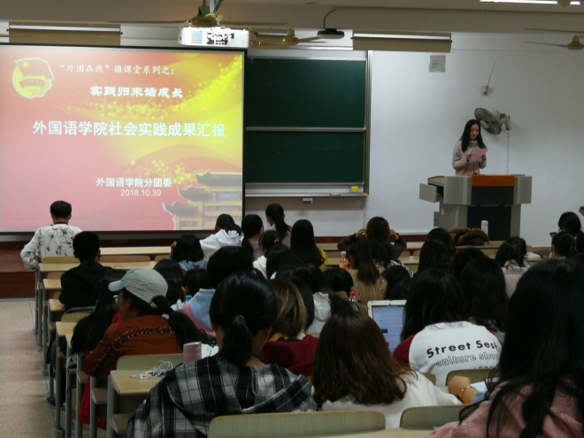 为引领广大青年学生践行习近平总书记系列重要讲话精神,凝聚青年学生坚定不移跟党走,引导学生勇做时代的开拓者、奉献者,yl7703永利集团于2018年暑期组织了以“贯彻党的十九大精神·风正扬帆当有为”为主题的社会实践活动,为了使学生对活动有更深认识,10月30日晚上六点半,yl7703永利集团于第二教学楼2D308教室开展了“实践归来话成长”暑期社会实践成果与经验分享报告会。yl7703永利集团分团委书记杨艳、2018级辅导员黄颖及全体2018级新生参加了此次分享会。
