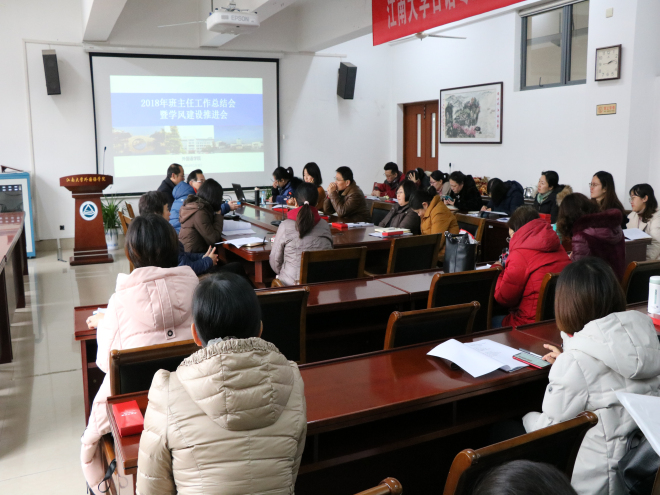 随后杨艳就2018年学院学生工作进行总结汇报。她从班级建设、学风建设、团支部建设等方面回顾了2018年的工作,具体解读了我院新制定颁布的班主任奖励办法,公布了2017-2018学年班主任奖励提名名单,并邀请获奖班主任进行经验交流分享。