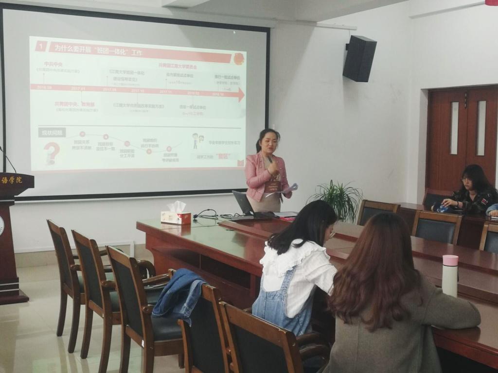 随后,杨老师以化工学院、医学院为例,为大家讲解了这两个学院的班团一体化建设方案和经验。她指出,班团一体化建设最重要的是明确团支委与班委的分工职责,构建统筹运行机制,贯彻落实“三会两课一制”制度,强化组织的政治性、先进性、群众性。