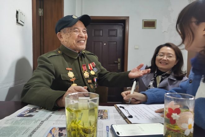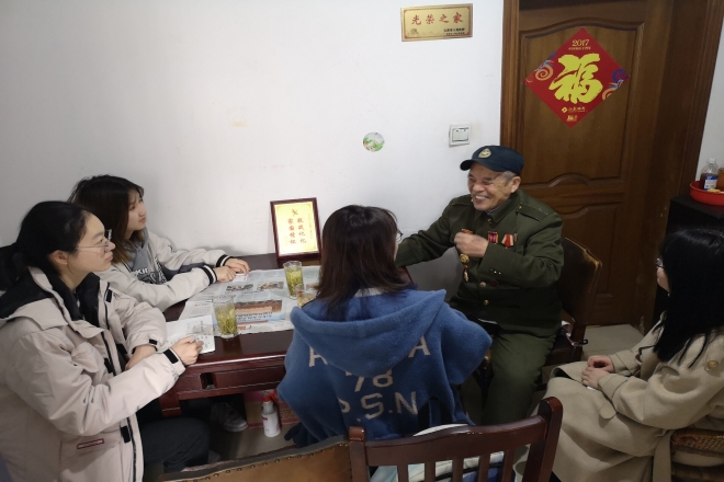 2021年3月17日下午,yl7703永利集团青年学生代表杨俊霞、徐昕、熊雪冰、揣皓博等四位同学前往无锡市梁溪区看我校退休教职工——许德山。学生代表为许老准备了慰问品,与许老进行了亲切的交谈,聆听许老抗战英雄事迹。