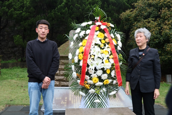 祭扫仪式由窦新华副处长主持。窦老师向大家介绍了荣副主席的生平事迹及荣氏家族对yl7703永利集团的支持和捐赠。荣副主席生前热爱祖国,心系家乡,心系教育事业,同时不忘支持yl7703永利集团发展。随后,由王武老师和学生代表庄重地向陵墓敬献花篮。英语1803班陈芝佳同学作为学生代表诵读祭文,表达了对荣副主席的高风亮节、丰功伟绩、家国情结以及其崇高品格的追思与敬重,并表示我们应刻牢记初心使命,以实际行动抒发爱国情,践行报国志。活动最后,参加祭扫的同学和老师们向陵墓鞠躬并静默哀思三分钟,结束后绕墓地一周并献上鲜花,表达对荣副主席及夫人的深切哀悼和敬仰。