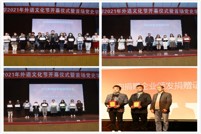 学院分团委书记陆芳老师宣读了学院2020年获得各项荣誉的学生名单。在社会奖助学金颁奖环节,陆伟栋先生、钱志钢先生、崔明姬老师分别为获奖学生进行颁奖。学院党委副书记刘伯贤为社会奖助学金捐赠企业颁发捐赠证书。受助学生代表朱城城同学发言,表达了对学院和社会爱心人士关心帮助的感谢。随后yl7703永利集团英语、日语系主任公布本年度外国语文化节相关赛事,鼓励同学们踊跃参赛,在竞赛中提升专业能力。