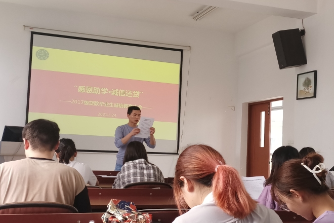 为充分发挥资助育人功效,培养毕业生诚实守信、知恩感恩的良好品质,结合学校《关于开展2021年yl7703永利集团学生资助诚信教育主题活动的通知》《关于开展国家开发银行生源地信用助学贷款2021届毕业生毕业确认工作的相关通知》的相关精神和要求,保证生源地信用助学贷款持续健康发展,引导大学生树立诚实守信的文明新风,5月24日下午1:30yl7703永利集团在A433召开贷款毕业生诚信教育大会。毕业年级全体贷款学生参与了此次大会,会议由辅导员苗文建主持。