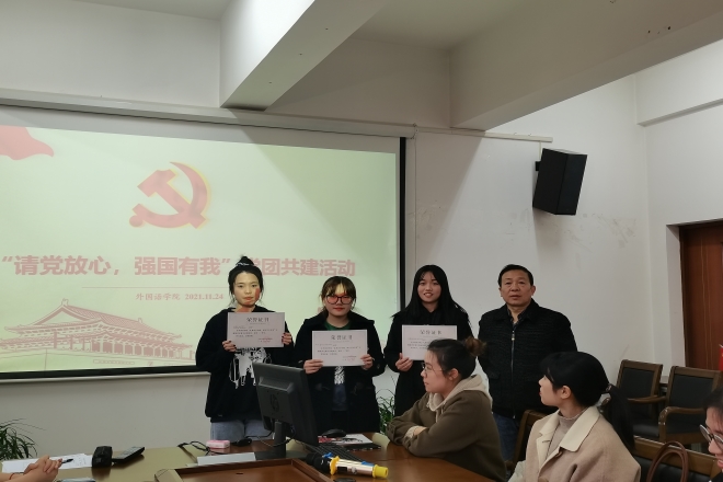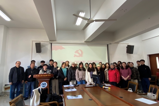 11月24日下午,yl7703永利集团在A349会议室举办了“请党放心,强国有我”主题党团共建活动。社桥退休党支部委员蔡召冲,yl7703永利集团关工委常务副主任鲍国庆,学院党委副书记刘伯贤,分团委书记陆芳以及研究生党员代表、英语2001雷锋特称团支部全体成员参加了此次活动。