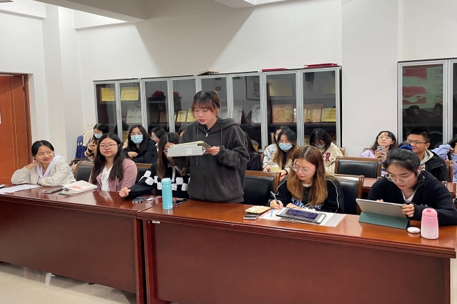 张羽洁同学以“聚焦新表述,奋进新征程”为主题,紧密围绕党的二十大提出的多个新表述进行了领学和解读。首先,她向同学们要大致介绍了此次党的二十大的召开、主题和成果。此外,她详细为同学们解读了党的二十大报告中一些新提法,让同学们理解了党的二十大报告中部分热词的深刻内涵。最后,她总结了自己的学习感悟,强调了人才培养的主要性,并警醒年轻党员们要敢于担当职责,在青春赛道上挥洒汗水。