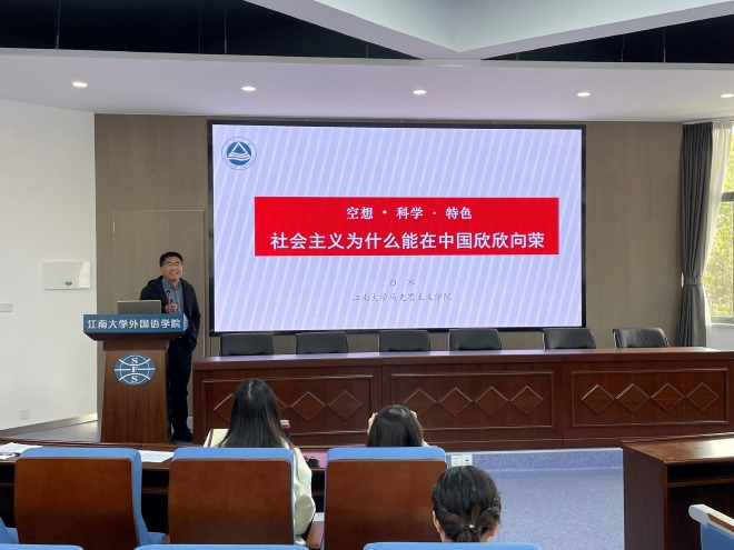 开班仪式结束后,由马克思主义学院白冰老师为大家带来开班第一讲:《空想·科学·特色——社会主义为什么能在中国欣欣向荣》。白冰老师从四个方面,即社会主义从空想到科学、从理论到实现、从一国到多国、从传统到特色,一步步讲述了社会主义五百年的历史以及社会主义在中国的探索与建立,并明确指出:中国特色社会主义道路是创造人民美好生活、实现中华民族伟大复兴的康庄大道。在讲座的最后,白冰老师对青年同学提出了殷切希望,他表示青春孕育着无限希望,青年能够创造美好明天。