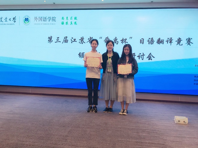 我校金明姬老师带领入围队员参加了在南京农业大学举办的翻译加试。最终日语专业张林薇同学、陆蓉同学分获得日译中组二、三等奖。这是我院继前两届“舜禹杯”翻译竞赛后再次收获佳绩。