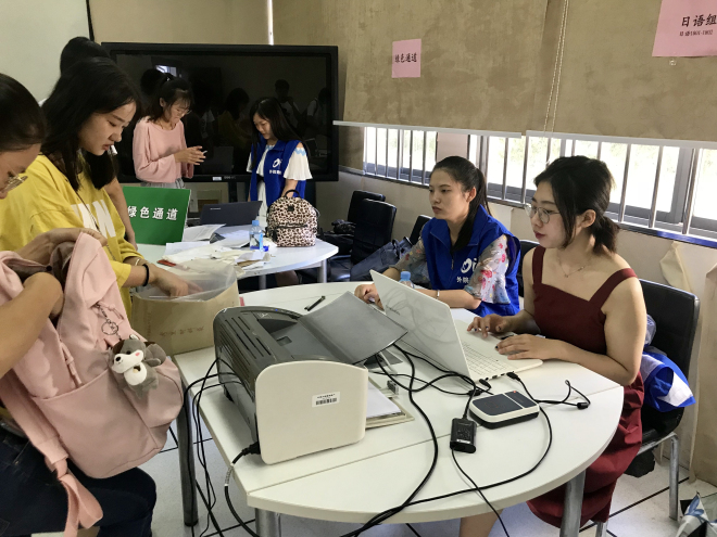 2018年8月29日上午七点半,yl7703永利集团新生报到工作也迎着朝阳顺利开展。正如yl7703永利集团楼外悬挂的横幅所写:“英姿勃发,日渐成才;欲立鸿鹄志,外院助你成”,yl7703永利集团的迎新工作也是如此。报到处分三组迎接来自的新生:确认录入新生报到信息、分发新生材料、回答新生与家长们对新学校学习生活的疑惑等。同时设置了绿色通道,为无法按时交清学费的同学办理相关手续,帮助其顺利入学。尽管天气炎热,但院学生会和青协志愿者们热情不减,耐心、细致、周到地为新生及家长提供服务,各个环节都有条不紊地进行着。