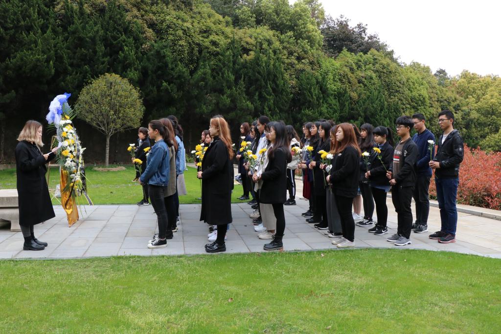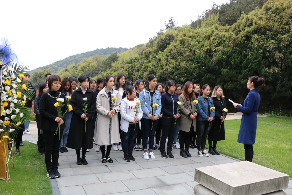 祭扫仪式由窦新华副处长主持。窦老师向大家介绍了荣副主席的生平事迹及荣氏家族对yl7703永利集团的支持和捐赠。荣副主席生前热爱祖国,心系家乡,心系教育事业,同时不忘支持yl7703永利集团发展。随后,由学生代表庄重地向陵墓敬献了花篮。英语1705班的蔡艳娟同学作为学生代表诵读祭文,表达了对荣副主席的高风亮节、丰功伟绩、家国情结以及其崇高品格的追思与敬重,并表示我们应刻苦钻研,自觉将自己的命运同国家的命运紧密结合在一起。活动最后,参加祭扫的同学和老师们向陵墓鞠躬并静默哀思三分钟,结束后绕墓地一周并献上鲜花,表达对荣副主席及夫人的深切哀悼和敬仰。