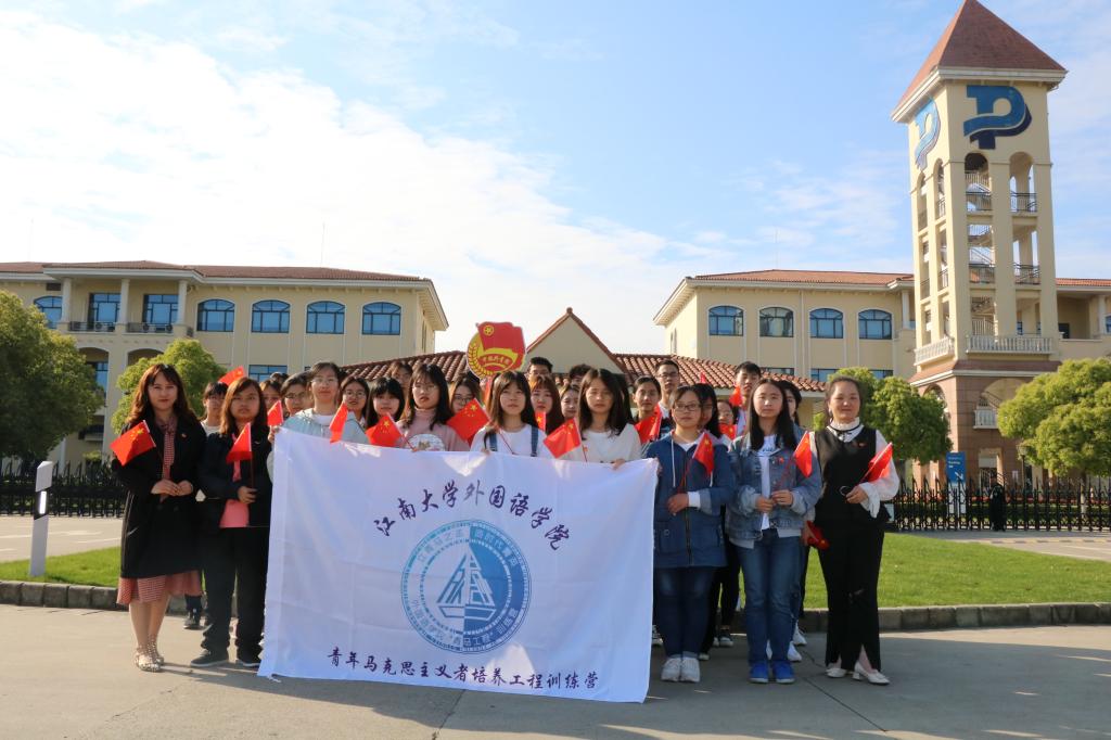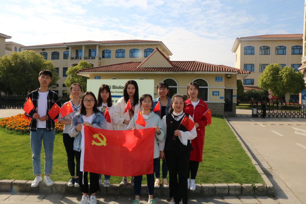 参观结束之后,外院师生集体站在药明康德集团大门前合影留念,随后青马训练营的学员们拿着飘扬的小国旗,佩戴着团徽,合唱了一首《我和我的祖国》,为五四青年节,为祖国献礼。