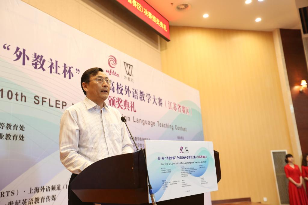 19日上午,颁奖典礼在我校远东报告厅举行。我校吴正国副校长、江苏省教育厅职业教育处徐萍副处长、上海外语教育出版社总编辑孙玉编审、江苏省高校外国语教学研究会会长李霄翔教授分别代表比赛承办单位、主办单位和全国组委会先后致辞。吴正国副校长对各位来宾表示热烈欢迎,他指出,本次教学大赛是省内优秀青年教师展示教学风采、相互交流切磋的绝好机会,相信所有参会老师一定都会从中受益,为今后的教学提升奠定良好的基础,激发教师们的教学热情,加深对教与学的深度思考,引领未来的教学实践。随后,大赛总评委、教育部高等学校大学外语教学指导委员会委员、南京大学王海啸教授代表评审组对本次大赛从文本解读、语言能力和教学方法等几个方面对此次大赛做了精彩点评。