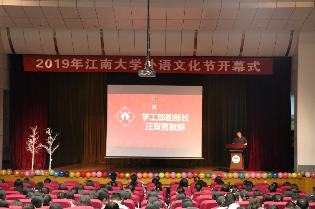 活动伊始,校学工部副部长汪双喜老师致辞。汪双喜老师首先对本届外语文化节的开幕表示了热烈的祝贺,并向付出辛勤劳动的老师同学们表达了衷心的感谢。他指出外语文化节是学校校园文化建设中的重要部分,也是学校提升人才质量的一项重要举措。本次外语文化节活动为江南学子搭建了一个活泼、有序、多元的语言文化交流平台和学习环境,激发了同学们学习语言的兴趣。希望广大江南学子在本次文化节中尽情释放自己的学习热情,共同掀起外语学习的浪潮。