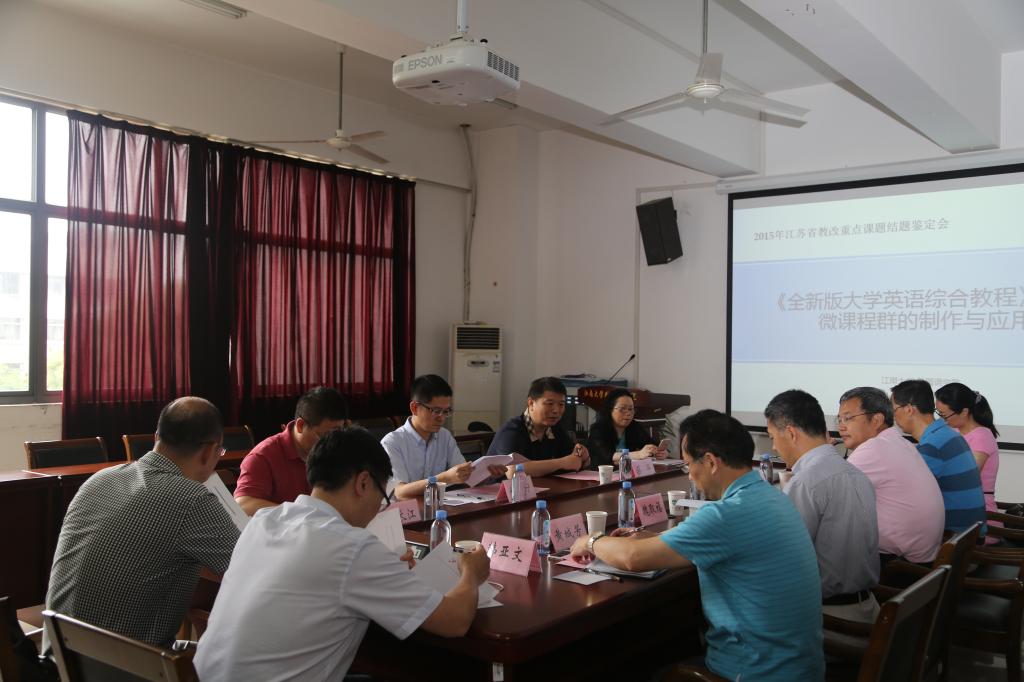 由我校yl7703永利集团撒忠清副教授和王伟炜老师共同主持的2015年江苏省高等教育教改研究立项重点课题——“《全新版大学英语综合教程》(2)微课程群的制作与应用”(2015JSJG634)于2017年6月24日下午在yl7703永利集团A349会议室举行了专家鉴定会。省教育厅派出了由南京大学yl7703永利集团副院长何宁教授任组长,苏州大学yl7703永利集团副院长孙倚娜教授、南京航空航天大学yl7703永利集团副院长刘教授、南京工业大学yl7703永利集团副院长韩亚文教授、盐城工学院yl7703永利集团院长邓笛教授组成的课题鉴定专家组。鉴定会由教育厅高教处蔡华处长主持,专家组全体成员、yl7703永利集团副校长纪志成教授、yl7703永利集团教务处处长魏取福教授、yl7703永利集团院长龚晓斌教授、书记黄城芳副教授、副院长方文开教授、副院长朱义华博士、课题组主要成员、上海外语教育出版社代表以及yl7703永利集团部分教学一线教师出席了现场验收会。
