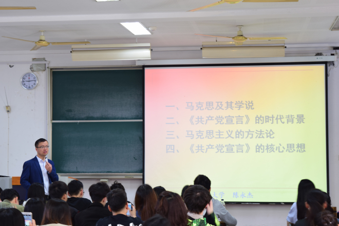 接着,陈永杰老师为我们上了一堂有趣生动的马原课——如何理解《共产党宣言》。课上,陈老师讲授了《共产党宣言》的背景及核心思想,马克思主义的方法论和理论体系。此外,陈老师谈到“己所不欲,勿施于人”是党员的标准,全心全意为人民服务并不是要完全放弃自己的个人利益,每个人的自由发展是一切人的自由发展的条件。他指出,所有学员,作为发展对象,应该加强党的组织观念,必须坚守党的信仰,坚定地为实现党的目标而奋斗。