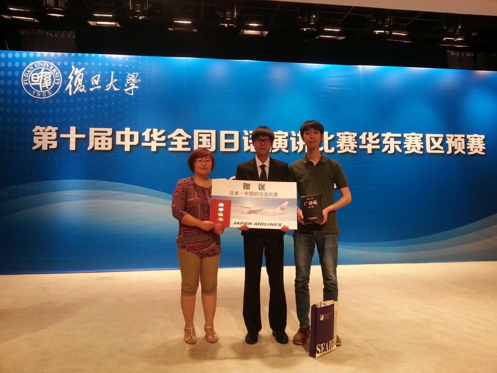 2015年06月13日,第十届中华全国日语演讲比赛华东赛区预赛在复旦大学举行,来自复旦大学、上海交通大学、上海外国语大学、浙江大学、南京师范大学、南昌大学等华东地区21所高校的参赛选手经过激烈角逐,共有8名同学获得不同奖项。我校2013级日语专业陈天泓同学发挥出色,力克华东地区多位名校的优秀代表选手,最终以优异的成绩获得了特等奖,崔明姬老师也获得了优秀指导教师奖,为我校争得了荣誉。这是日语系学子在该项赛事中取得的第二次特等奖。