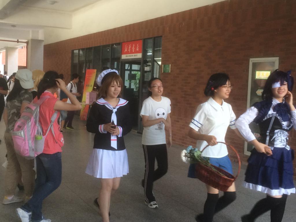 漫步在校园内,随处可见身着奇装异服的coser,像从漫画书中偷溜出来的人物。他们自信从容地从我们身旁经过,丝毫不在意我们讶异的眼神。当我们要求合照时,他们也大大方方地接受,不会有半点羞涩局促。