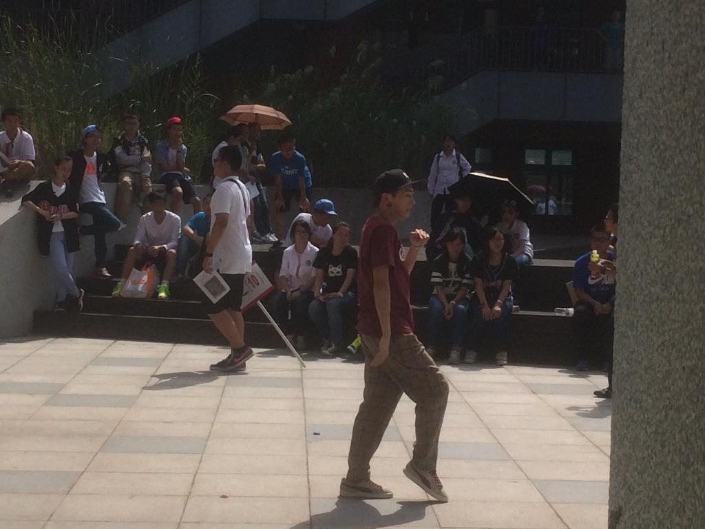 来到初中部教学楼的二楼,街舞社的同学们正在进行精彩的表演。一名舞者正在舞台中央跟随着音乐肆意舞动,音乐一停,另一名舞者不甘示弱地上前,大有斗舞的局势。围观的同学都聚精会神地看着,并报以热烈的掌声。