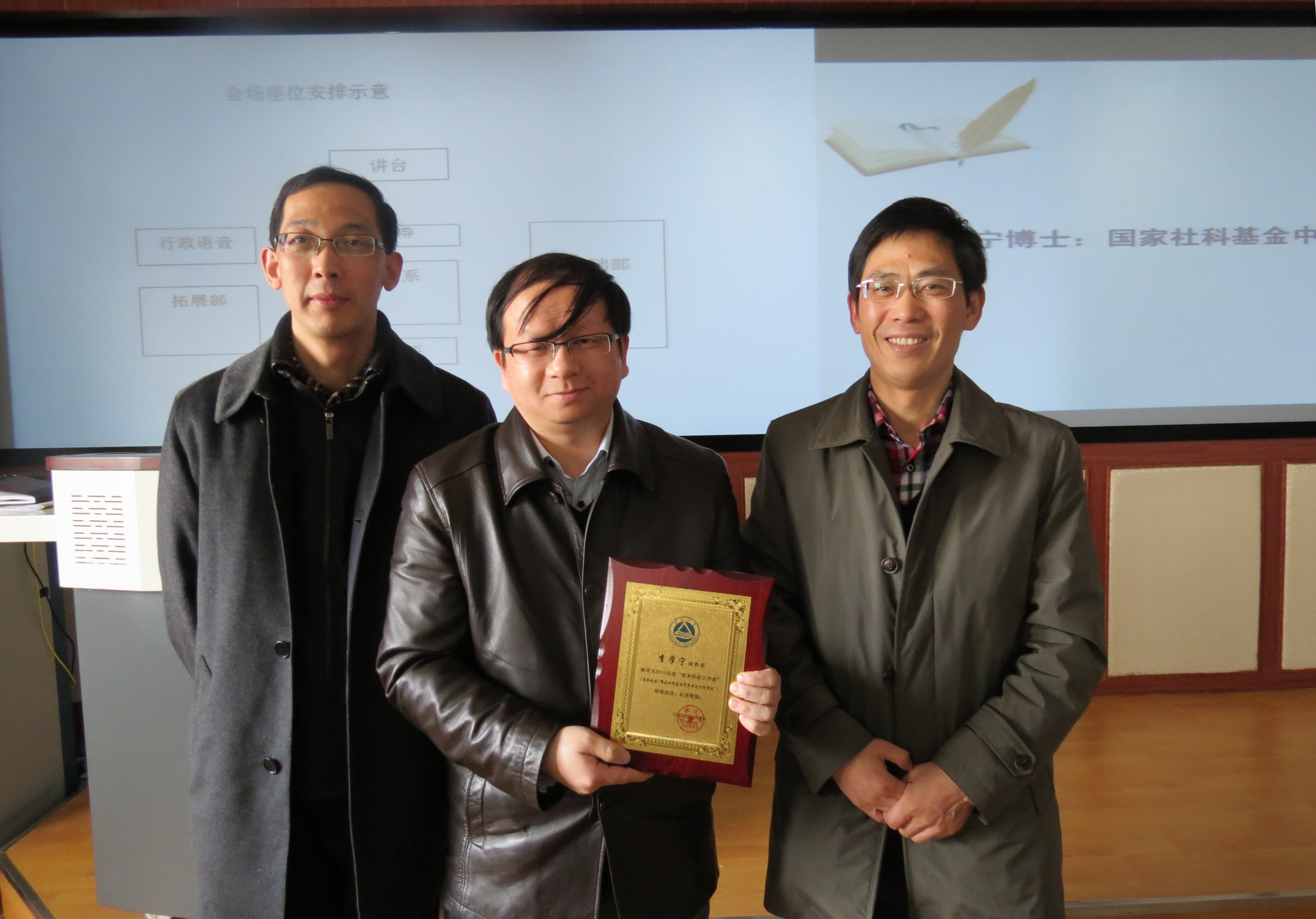 2014年3月13日,学院教工大会上,周建中书记、龚晓斌院长为李学宁老师颁发了荣誉证书。