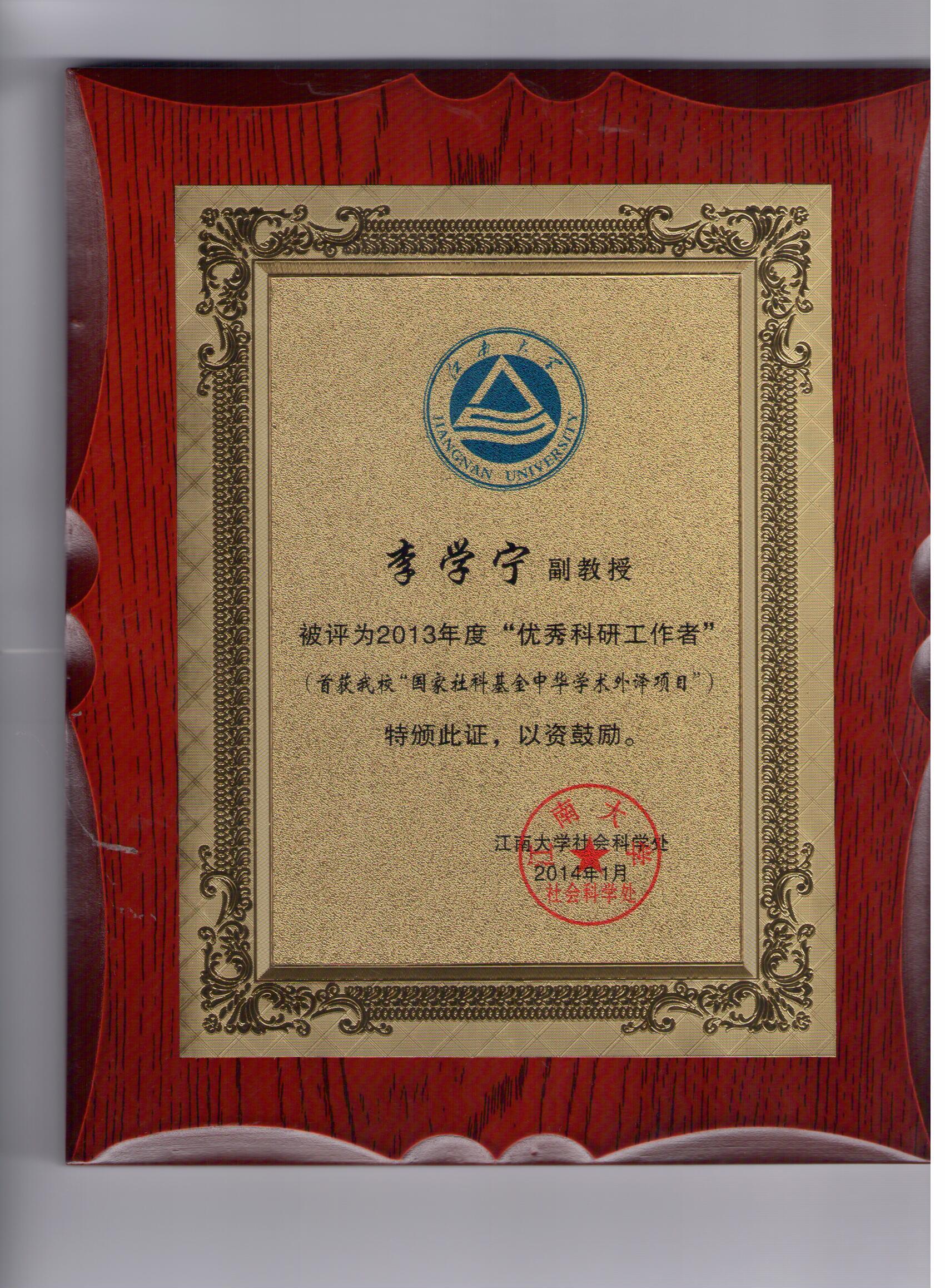 从刚刚召开的我校科研工作会议上获悉,我院李学宁副教授被学校评为2013年度“科研优秀工作者”,其研究项目“爱与思——生活儒学的观念”—首获我校“国际社科基金中华学术外译项目”。