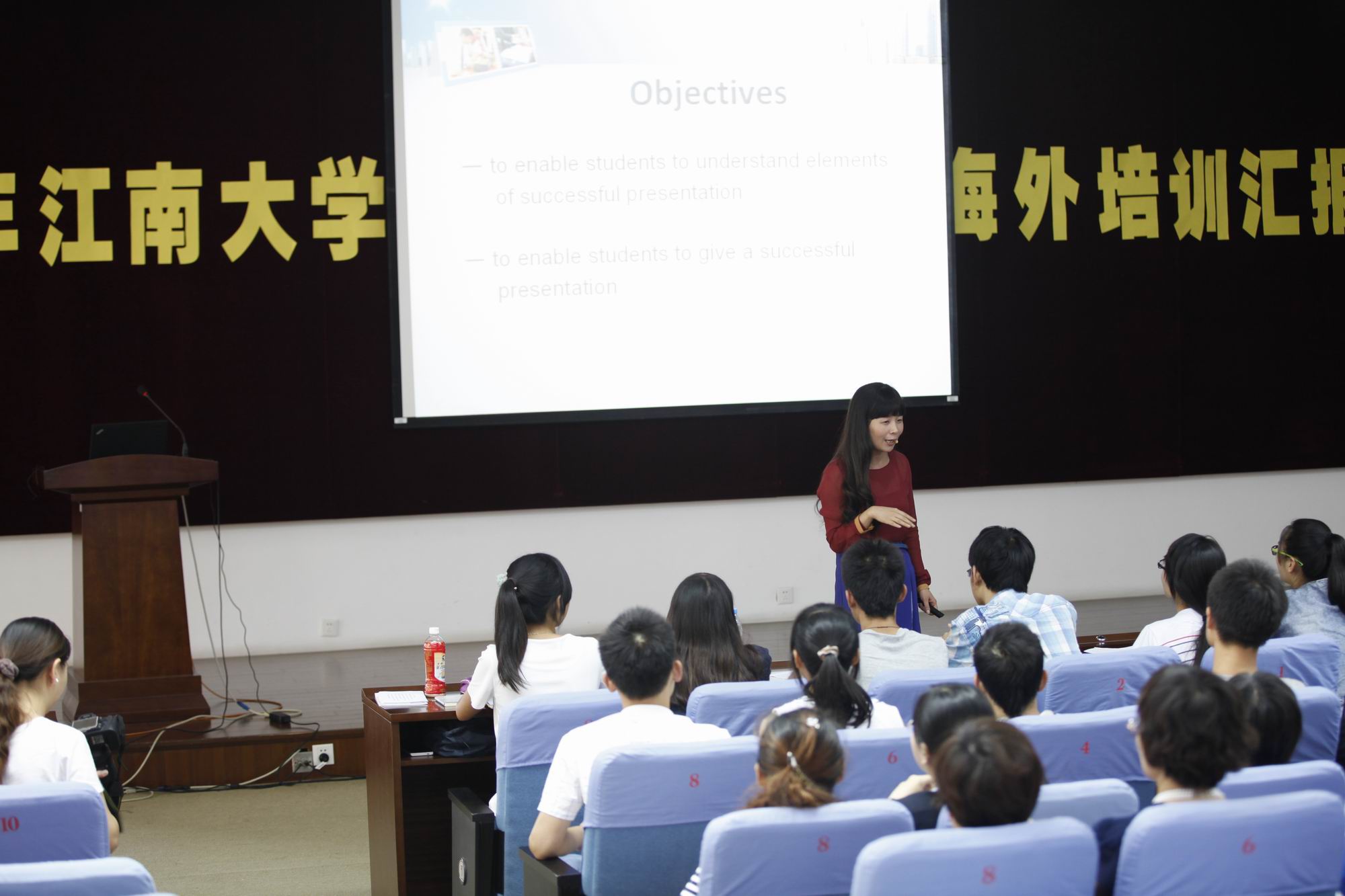 汇报会上,大学英语拓展部主任兼首轮海外培训班班长谢竞贤老师代表前往加州大学戴维斯分校培训的学员做了学习汇报。她简要介绍了加州大学戴维斯分校和培训课程,重点从课程设计、教学方法、教师表演、学生自主、积极评价、鼓励创新等多方面对美式教学进行了分析与阐述。胡燕萍老师运用布卢姆的目标分类模式进行教学设计,与学生充分互动;周迓菁老师运用教学评价量规的方法设计教学;马晓云老师运用需求分析和多元智能理论设计了ESP课程,三位老师展现了各具特色的以学生为中心的互动型外语学习教学,多次指导教师授课获奖的唐灵芝老师对示范课做了精彩点评。