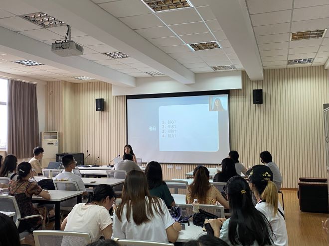 首先是考博经验分享环节,2位2018级硕士研究生进行了分享。李贵洁同学主要从考博的前期准备、考试情况以及考试后的注意事项与建议三个方面分享了自己的国内考博经验,向同学们推荐了许多考博过程中可以关注的网站、软件和面试技巧等,建议同学们明确目标,调整心态,以及注重身体健康。欧阳云静同学从申博准备、联系导师、面试、申请奖学金以及经验总结五个方面分享了自己的海外博士申请经验,在经验总结部分,她提到:学术成果是一点一点积累的,应该及早准备,安排好时间,要敢于主动联系导师敢于表达自己,同时要在与导师与工作人员交流的时候注意礼貌。