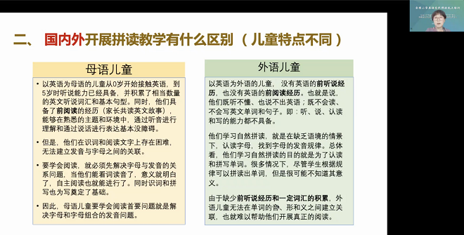 美国杰克逊州立大学教育学博士、集美大学yl7703永利集团教授、外语教师教育与发展研究所所长张海燕教授的话题为《小学英语教学中语音意识的培养》。她首先介绍了语音意识的定义及其构成要素,强调了它在自然拼读和语言学习中的重要性。通过具体实例的拼读教学演示辨析了一系列语音学术语。同时,她分享了美国课堂中提高学生语音意识的方法,为我国教师开展自然拼读教学提供了启示。
