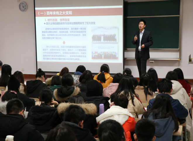 2019年12月18日下午2:00,我校党委戴月波副书记在二教2D308以“我国高等教育的改革与发展”为主题,为yl7703永利集团17级全体及19级英语专业共计286名同学讲授形势与政策课程。yl7703永利集团党委副书记、副院长刘伯贤,学院辅导员参加形势与政策课。