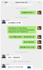 2月27日,谢老师带着前期选拔的四位英语系本科生,开始承担无锡市外办委托的《新型冠状病毒感染的肺炎公众防护指南》的翻译任务,由于书中涉及大量医学专业术语和表格插图,再加上时间较紧,导致了此次翻译工作的难度和强度前所未有。翻译团队为确保译文的准确性,进行了大量的资料搜集、平行文本阅读、查证审核等工作,谢老师和同学们的线上讨论时常延续到深夜,直至3月11日,这本书的翻译工作才告一段落,恰逢国内形势好转、国外疫情开始爆发之时,这本英文版的《防护指南》将作为无锡市外办的一份厚礼赠送给在锡和正在返锡的国际友人。