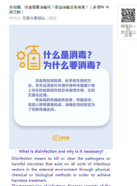 除了承担此书的翻译任务,谢老师还担当了无锡市外办公众号的英文翻译任务。虽然线上教学和指导学生等“分内之事”已经很繁忙,但谢老师认为比起那些勇赴一线的“白衣天使”,自己的这点付出只是略尽绵薄之力。