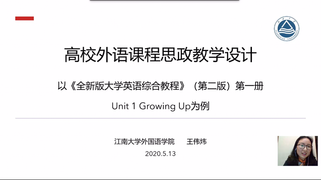 王伟炜老师分享了《全新版大学英语综合教程》(第二版)第一册第一单元《成长》的思政教学设计。该设计把思政要点有机地融入到语言教学的各个环节,通过巧妙细致的课程设计,用正能量潜移默化地引导学生树立正确的世界观、人生观、价值观。