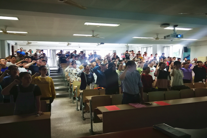 军训动员大会在庄严的国歌声中开始。首先人武部韦红武为大家介绍了军训的重要意义和军训要求,韦老师强调:爱国爱军是青年学子深沉的情感,军训是一次难得的锻炼成长机会,大家要敢于吃苦,但过程中要注意安全。韦老师充满激情的动员讲话激发了大家军训的热情,更加坚定了同学们以高昂的斗志投身于此次军训的决心。接着学院党委副书记刘伯贤介绍了当前的形势热点,重点强调了军训的重要性,刘书记说:同学们通过此次军训磨炼自己的意志,将为以后的学习及生活奠定良好的身体素质及意志基础。同时刘书记代表学院对参加军训的学生们提出了三点期望:一提高意识,矢志报国;二严于律己,服从指挥;三顽强拼搏,收获成功。在介绍军训相关要求环节,辅导员杨艳老师讲述军训细则以及相关要求,并希望同学们认真对待此次军训,严格要求自己。最后,19级军训优秀学员赵秋棋分享了自己的军训感悟,为同学们提供了军训经验。