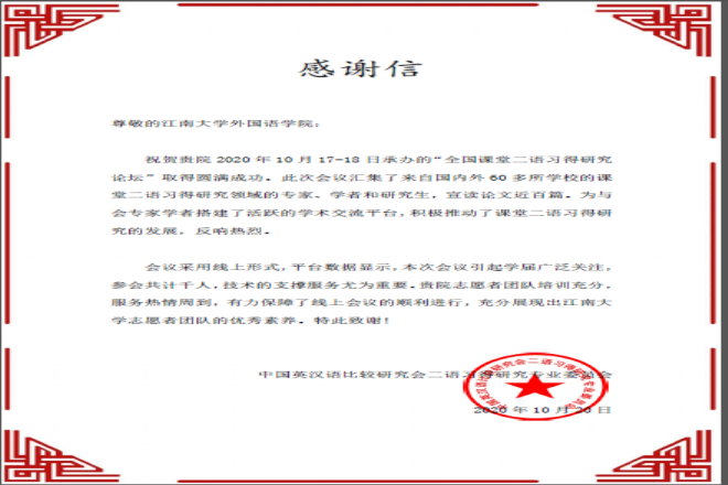 在本次活动期间,志愿者们反应快速,服务到位,充分展现了我院志愿者团队的优秀素养,积极保障了本次二语习得论坛的顺利进行。会议结束以后,各个学校的专家、研究者们向yl7703永利集团的志愿者团队表示感谢。中国英汉语比较研究会二语习得研究专业委员会也向yl7703永利集团发来了感谢信,感谢学院和志愿者团队的辛勤付出。