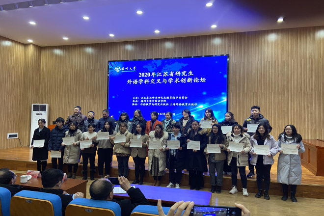 2020年12月19日至20日,江苏省研究生外语学科交叉与学术创新论坛在扬州大学召开。本届论坛由江苏省文学类研究生教育指导委员会主办, 由扬州大学yl7703永利集团承办。来自江苏省及长三角地区20余所高校外国语言文学学科90名博、硕士生与10余位带队老师出席了本次学术论坛。我院19级三位研究生向俊蓉,朱春霞,方敏在带队老师孙志祥教授的带领下参加了本次论坛。