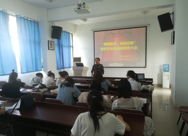 为充分发挥资助育人功效,培养毕业生诚实守信、知恩感恩的良好品质,结合学校《关于开展2019年yl7703永利集团学生资助诚信教育主题活动的通知》《关于开展国家开发银行生源地信用助学贷款2019届毕业生毕业确认工作的相关通知》的相关精神和要求,保证生源地信用助学贷款持续健康发展,引导大学生树立诚实守信的文明新风,5月29日上午10点yl7703永利集团在A433召开贷款毕业生诚信教育大会。毕业年级全体贷款学生参与了此次大会,会议由毕业班辅导员杨艳主持。