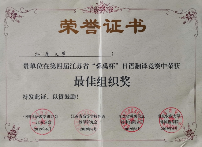 据悉,第四届江苏省“舜禹杯”日语翻译竞赛于2019年1月启动,在控制稿件数量的前提下,3月底截稿时共收到江苏省内26所高校和省外19所高校寄来参赛译文共计409篇,其中日译汉303篇,汉译日106篇,参赛者均是中文为母语的日语专业在校大学生或研究生。4月份经过翻译界专家及评委的匿名评审,共评选出入围稿件日译汉30篇、汉译日10篇。6月1日对入围同学进行现场加试,在紧张的专家现场评审之后,综合初赛成绩,评选出汉译日、日译汉的各级奖项及优秀组织奖。由崔明姬老师带队,我院参赛队伍于6月1日前往南京参加在南京农业大学举办的翻译加试赛。
