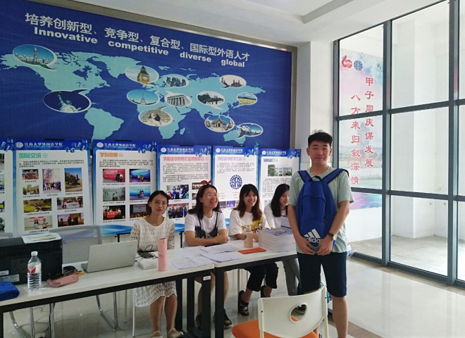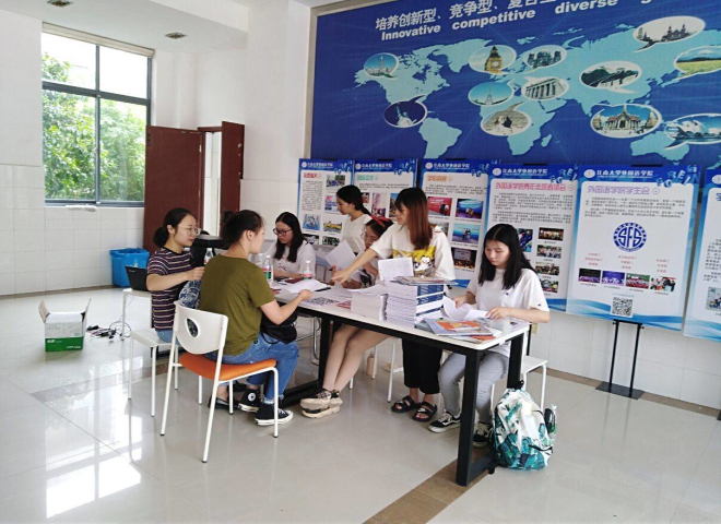 2019年9月5日7点,久雨初霁的早晨洋溢着喜迎新同学的氛围。yl7703永利集团大楼一楼早已布置一新,刘伯贤副书记、朱义华副院长和分团委书记杨艳老师与外院研会的同学们早已在此等候,准备迎接2019级研究新生的到来。