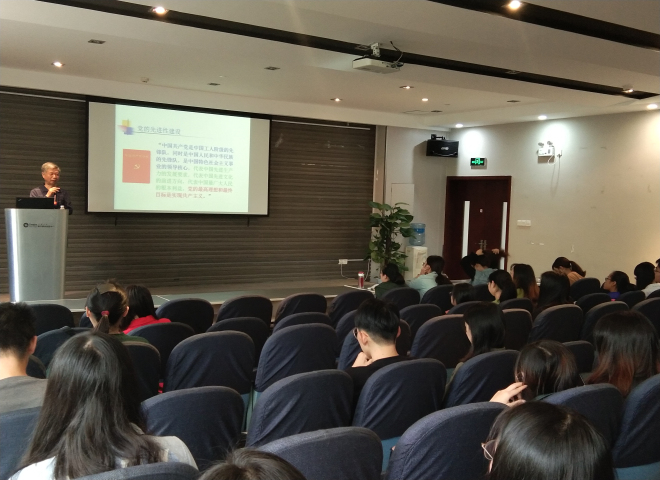 娄国栋老师以党章为引子,从党的建设历史经验、新时代党的先进性建设、新任务新要求这三个方面对党的先进性建设展开阐释,并提出广大青年要坚定理想信念,志存高远,脚踏实地,勇做时代的弄潮儿,在实现中国梦的生动实践中放飞青春梦想,在为人民利益的不懈奋斗中书写人生华章!