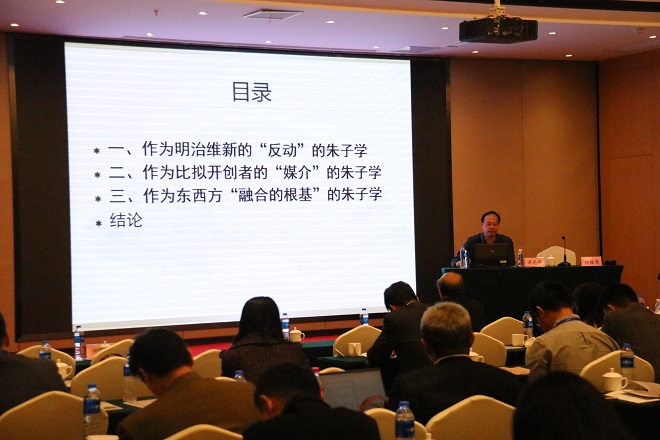 开幕式结束后由三位特邀教授进行了主旨报告讲座。第一场由北京外国语大学徐一平教授就日语名词叠词的特殊性,并结合语料库的功能进行了探讨,第二场由大阪大学的古川裕教授就中日语教学中汉字带来的负面作用及该如何在教学中避免负面作用进行了探析,第三场由厦门大学的吴光辉教授以明治时代的儒学批评为媒介,对“日本朱子学”进行了哲学性探微,三位教授的主旨报告深入浅出,生动有趣,发人深思,参会代表奋笔疾书,积极提问,整个会场气氛隆重而热烈。