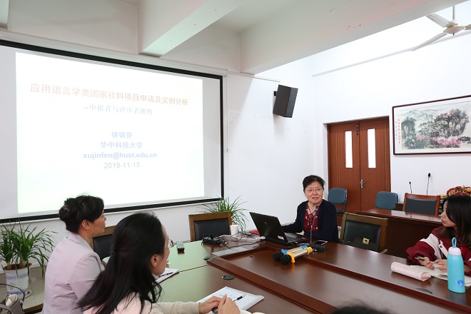 11月15日下午,2019外语学科系列讲座第十一期在yl7703永利集团A349开讲。本次讲座由华中科技大学yl7703永利集团二级教授,博士生导师徐锦芬老师主讲,讲座的主题是:应用语言学类国家社科项目申请及实例分析。参与本次专题讲座的有从事英语教学、二语习得研究的教师和各年级研究生,讲座现场气氛热烈,座无虚席。