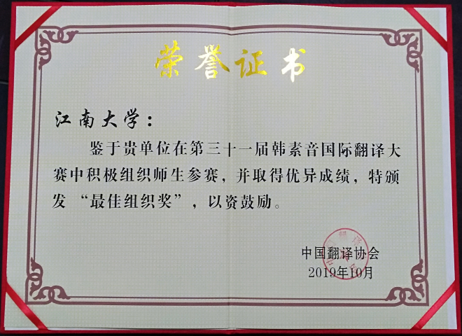 2019年第三十一届韩素音国际翻译大赛由中国翻译协会、北京外国语大学、福建师范大学联合主办,《中国翻译》编辑部、北京外国语大学高级翻译学院、福建师范大学yl7703永利集团联合承办。大赛汇聚了来自国内外各个行业的优秀参赛者,共收到有效参赛译文11900份。经过三轮的严格评审和终审讨论,共评出获奖者346名,得奖率仅为2.9%。鉴于我校积极组织学生参赛,并取得优异成绩,我校荣获大赛组委会颁发的“最佳组织奖”。