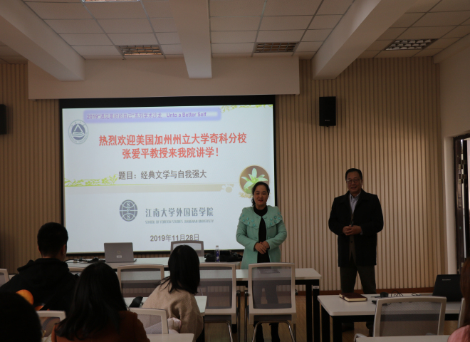 11月28日下午13:30,外语学科系列讲座暨第七期“遇见更好的自己”名师沙龙活动在学院A529准时召开。讲座的主讲人是来自美国加州州立大学奇科分校英语系荣休教授张爱平,本次讲座的主题是:经典文学与自我强大。参加本次沙龙活动的有本科生和研究生,讲座由分团委书记杨艳老师主持。